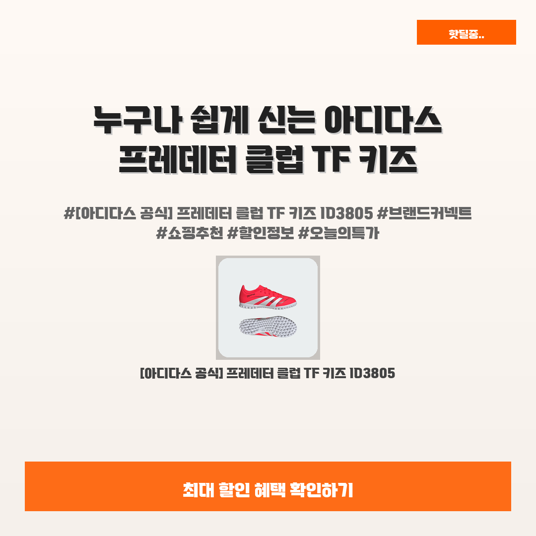 🛍️ 이 포스팅은 네이버 쇼핑 커넥트 활동의 일환으로,판매 발생 시 수수료를 제공받습니다.오늘 소개할 제품은 바로,,누구나 쉽게 신는 아디다스 공식 프레데터 클럽 TF 키즈 ID3805입니다!아이들이 뛰어놀고 싶어하는 날, 발에 맞는 좋은 운동화를 찾는 것이 정말 어렵죠. 그러다보면 발이 아프거나 마음에 들지 않는 제품을 사게 되기 일쑤인데요, 프레데터 클럽 TF 키즈는 그런 걱정을 덜어 줄 수 있어요.이 신발은 아이들이 좋아할 스타일과 편안함을 동시에 갖추었고, 가성비까지 우수해요. 현재 정가 59,000원에서 50% 할인된 29,500원에 만나보실 수 있으니, 기회를 놓치지 마세요!지금 바로 이 완벽한 선택을 통해 아이에게 즐거운 운동시간을 선물해 주세요. 후회 없는 선택이 될 거라 확신합니다!※ ..